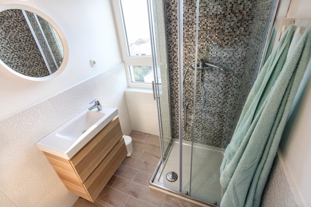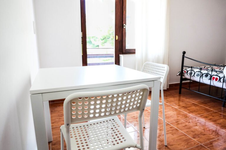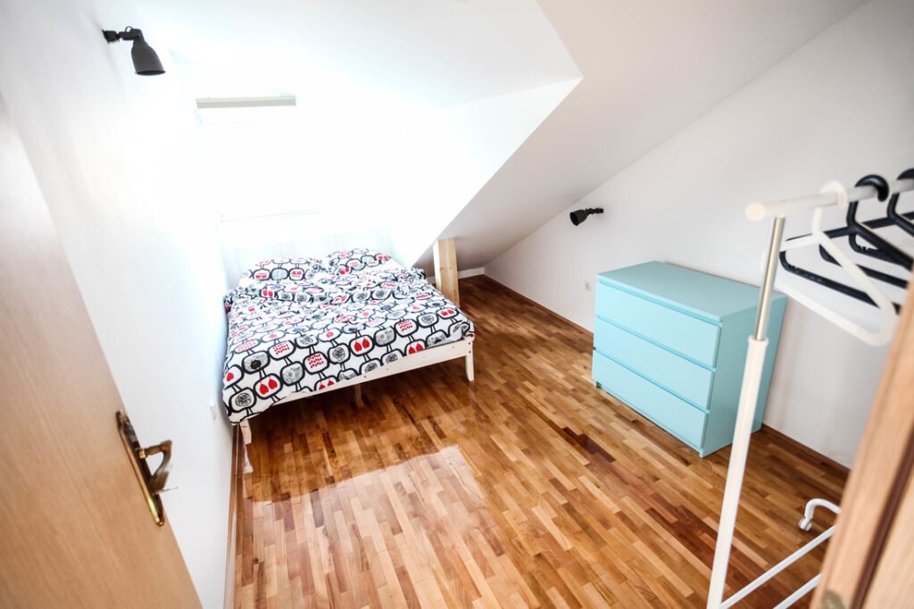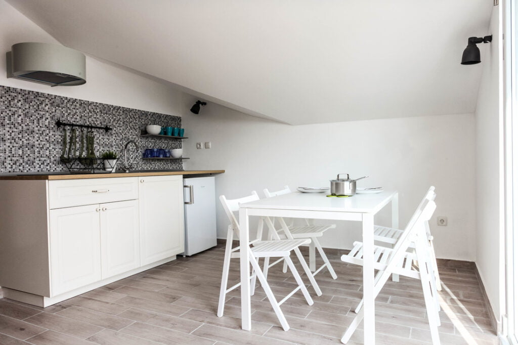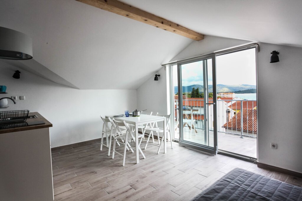 Penthouse 2 (two double-bed rooms and two balconies, with panoramic sea-view): 60 m2, top floor, oriented south, west and north, accommodates four adults.